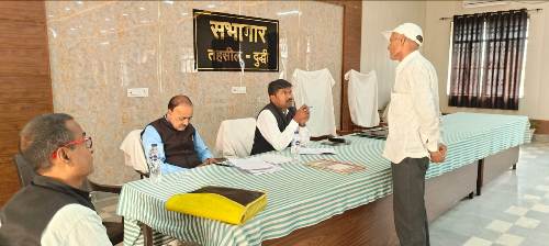 दुद्धी, सोनभद्र। स्थानीय तहसील सभागार कक्ष में आज शनिवार को तहसील समाधान दिवस का आयोजन किया गया।जिसकी अध्यक्षता नायब तहसीलदार ओपी सिंह एवं ज्ञानेंद्र कुमार के द्वारा किया गया। तहसील दिवस के दौरान फरियादियों के द्वारा कुल 15 मामले सामने आए जिसमें 01 मामले का निस्तारण किया गया। शेष मामलों को एक सप्ताह के अंदर निस्तारण के निर्देश दिए।शनिवार को जिले में शनिवार को सूबे के मुख्यमंत्री योगी आदित्यनाथ का भगवान बिरसा मुंडा जनजाति गौरव दिवस के अवसर पर आगमन हुआ था,इस कारण तहसील दिवस में उच्च अधिकारी गण उपस्थित नहीं हो सके,जिससे तहसील दिवस में लोगों की भीड़ नहीं दिख रही थी। इस मौके पर कोतवाल स्वतंत्र कुमार, सिंह श्याम जी यादव, शैलेश मोहन, विवेक सहित ज्यादातर विभागों के प्रतिनिधि मौजूद रहे।