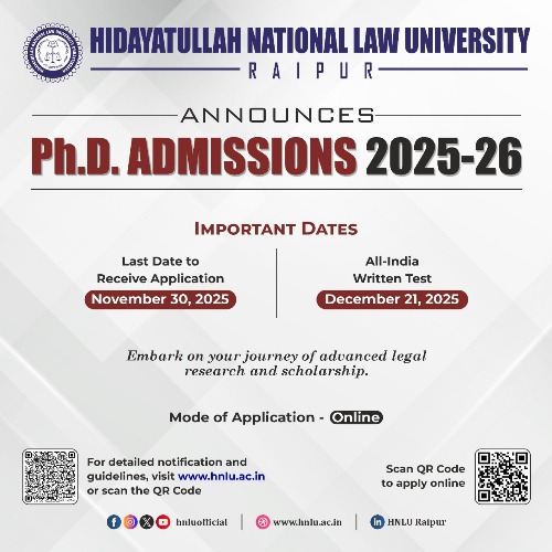 रायपुर,/ हिदायतुल्लाह राष्ट्रीय विधि विश्वविद्यालय (एचएनएलयू), रायपुर पी.एच.डी. कार्यक्रम 2025–26 में प्रवेश हेतु आवेदन आमंत्रित करता है। विश्वविद्यालय दो शोध धाराओं में प्रवेश प्रदान करता है — पी.एच.डी. इन लॉ (Ph.D. in Law) तथा पी.एच.डी. इन लॉ एंड इंटर-डिसिप्लिनरी स्टडीज़ (Ph.D. in Law and Inter-disciplinary Studies)।