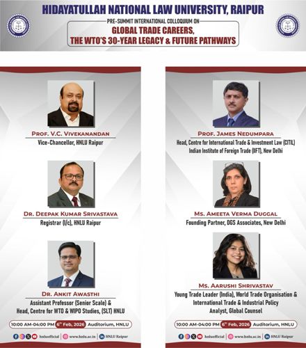 हिदायतुल्ला नेशनल लॉ यूनिवर्सिटी (एचएनएलयू), रायपुर ने अपने सेंटर फॉर डब्ल्यूटीओ एवं डब्ल्यूआईपीओ स्टडीज़, स्कूल ऑफ लॉ एंड टेक्नोलॉजी के माध्यम से, वाणिज्य एवं उद्योग मंत्रालय, भारत सरकार के डब्ल्यूटीओ चेयर्स प्रोग्राम के अंतर्गत, डब्ल्यूटीओ यंग ट्रेड लीडर्स प्रोग्राम तथा सेंटर फॉर ट्रेड एंड इन्वेस्टमेंट लॉ (सीटीआईएल), आईआईएफटी के सहयोग से “वैश्विक व्यापार में करियर, डब्ल्यूटीओ की 30-वर्षीय विरासत और भावी दिशाएँ” विषय पर एक दिवसीय प्री-समिट अंतरराष्ट्रीय कोलोक्वियम का सफलतापूर्वक आयोजन किया।