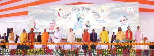 राष्ट्रीय स्वयं सेवक संघ के सरसंघचालक डॉ0 मोहन भागवत ने कहा कि हमें गीता को अपने जीवन में उतारना आवश्यक है। गीता में कुल 700 श्लोक हैं। यदि हम प्रत्येक दिन गीता के 02 श्लोक पढ़ेंगे, उनपर मनन करेंगे तथा उससे प्राप्त सार अपने जीवन में लागू करेंगे, तो हमारा जीवन वर्षभर में गीतामय बनने की दिशा में अग्रसर हो जाएगा। जैसे कुरुक्षेत्र में अर्जुन मोहग्रस्त हुए थे, वैसे ही आज सम्पूर्ण विश्व जीवन के रणांगन में भय व मोह ग्रस्त होकर दिग्भ्रमित हो चुका है। जैसा कि मुख्यमंत्री जी ने कहा कि हमें धर्मानुसार कार्य करते हुए फल की चिन्ता नहीं करनी चाहिए। जो भी परिणाम प्राप्त होगा, उससे हमें लाभ ही मिलेगा। इस अवसर पर जियो गीता के संस्थापक स्वामी ज्ञानानन्द जी महाराज, अखिल भारतीय आचार्य महासभा के महासचिव स्वामी परमात्मानन्द जी महाराज, स्वामी श्रीधराचार्य जी महाराज, स्वामी सन्तोषाचार्य जी महाराज, स्वामी धर्मेन्द्र दास जी महाराज सहित अन्य गणमान्य व्यक्ति उपस्थित थे।