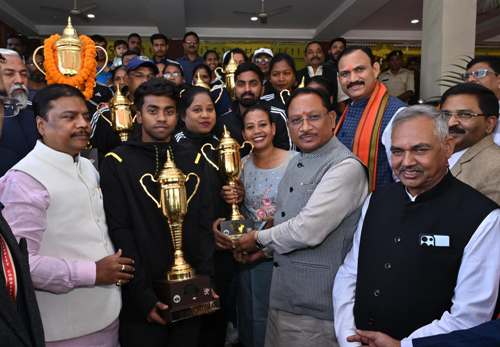रायपुर / मुख्यमंत्री विष्णु देव साय ने आज राजधानी रायपुर स्थित मेडिकल कॉलेज परिसर में ऑल इंडिया फ़ॉरेस्ट स्पोर्ट्स मीट में लगातार 13वीं बार ओवरऑल चैंपियन बनने वाले छत्तीसगढ़ के विजेता खिलाड़ियों से मुलाकात की। उन्होंने सभी खिलाड़ियों को इस शानदार उपलब्धि के लिए हार्दिक बधाई एवं शुभकामनाएँ दीं। मुख्यमंत्री श्री साय ने खिलाड़ियों का उत्साहवर्धन करते हुए कहा कि अपने उत्कृष्ट प्रदर्शन से उन्होंने छत्तीसगढ़ का मान पूरे देश में ऊँचा किया है और उनकी यह उपलब्धि पूरे प्रदेश के लिए गर्व का विषय है।