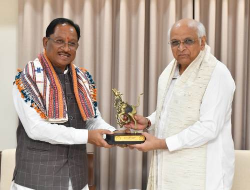 रायपुर,/ मुख्यमंत्री विष्णु देव साय ने आज गांधीनगर स्थित मुख्यमंत्री आवास में गुजरात के मुख्यमंत्री भूपेंद्र पटेल से सौजन्य भेंट की। इस अवसर पर दोनों मुख्यमंत्रियों ने परस्पर सहयोग एवं विकास के अनुभव साझा किए।
