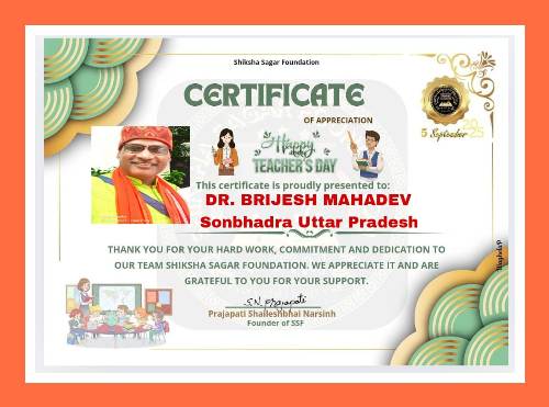 शिक्षक दिवस की शुभकामनाएँ देते हुए उन्होंने बताया कि यह प्रमाण पत्र डॉ. बृजेश महादेव सोनभद्र उत्तर प्रदेश को गर्व से प्रदान किया जाता है। शिक्षा सागर फाउंडेशन की हमारी टीम के प्रति आपकी कड़ी मेहनत, प्रतिबद्धता और समर्पण के लिए है। हम आपकी सराहना करते हैं और आपके सहयोग के लिए आपके आभारी हैं। डॉ बृजेश महादेव एक नवाचारी शिक्षक हैं जिनके नवाचार से देश भर के शिक्षार्थी लाभान्वित हो रहे हैं। आप द्वारा कौन लगाएगा शतक, मोबाइल क्लास, साहित्य सरोवर ई पत्रीका जैसे नवाचार देश के कोने कोने में पहुंच रहा है। डॉ बृजेश महादेव शिक्षक के साथ एक साहित्यकार भी है और एक दर्जन से अधिक पुस्तकें भी प्रकाशित हो चुकी हैं। डॉक्टर बृजेश महादेव को सभी शुभ चिंतकों ने बधाई दी है।