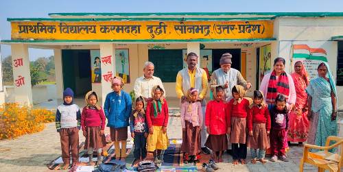 दुद्धी/सोनभद्र। भीषण शीतलहर के बीच दुद्धी व्यापार मंडल अध्यक्ष अमरनाथ जायसवाल ने मानवता की मिसाल पेश की। शुक्रवार को उन्होंने अपनी पत्नी मनोरमा जायसवाल के साथ ग्राम पिपरडीह स्थित कंपोजिट विद्यालय, मल्देवा के बराईडाड प्राथमिक विद्यालय तथा करमदाहा विद्यालय में पढ़ने वाले बच्चों को स्कार्फ, मफलर और टोपी वितरित की।इस पहल से बच्चों को ठंड से राहत मिली और उनके चेहरे पर मुस्कान दिखाई दी। कार्यक्रम में मल्देवा ग्राम प्रधान प्रतिनिधि निरंजन जायसवाल भी उपस्थित रहे। अमरनाथ जायसवाल ने कहा कि शीतकाल में बच्चों के स्वास्थ्य की सुरक्षा और उन्हें शिक्षा के प्रति प्रेरित करना ही इस सेवा कार्य का उद्देश्य है।विद्यालय प्रबंधन, शिक्षकों और ग्रामीणों ने इस कार्य की सराहना करते हुए इसे समाज के लिए प्रेरणादायक बताया। क्षेत्रीय लोगों ने अमरनाथ जायसवाल एवं उनकी पत्नी के प्रति आभार जताया।