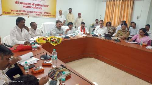 सोनभद्र। प्रदेश सरकार के स्टांप एवं पंजीयन मंत्री एवं जनपद के प्रभारी  रविंद्र जायसवाल ने बुधवार को सर्किट हाउस के सभागार में शासन के विकास प्राथमिकता वाली योजनाओं की समीक्षा बैठक की। बैठक के दौरान मंत्री ने उपस्थित अधिकारियों को निर्देशित करते हुए कहा कि देश के प्रधानमंत्री व प्रदेश के मुख्यमंत्री योगी आदित्यनाथ ने 2047 तक भारत को विकसित राष्ट्र बनाने का संकल्प लिया है, उस संकल्प को पूरा करने के लिए सरकार द्वारा संचालित योजनाओं से जन-जन को  लाभानित करने के साथ ही शिक्षा व्यवस्था को बेहतर करने की आवश्यकता है। शिक्षा व्यवस्था बेहतर होगी तभी देश पूर्ण विकसित राष्ट्र बनेगा, पूर्ण राष्ट्र बनने के लिए शिक्षा व्यवस्था  बेहतर करने की आवश्यक है। इसलिए प्रदेश सरकार ने शिक्षा व्यवस्था को सुदृण करने हेतु अनेक प्रकार की योजनाएं संचालित की हैं।  इस मौके पर प्रदेश सरकार के समाज कल्याण राज्य मंत्री संजीव कुमार गोंड, विधायक घोरावल डॉक्टर अनिल मौर्य, भाजपा जिला अध्यक्ष नंदलाल गुप्ता, जिलाधिकारी , पुलिस अधीक्षक. अभिषेक वर्मा, मुख्य विकास अधिकारी जागृति अवस्थी, अपर जिलाधिकारी (वि/रा) वागीश कुमार शुक्ला, डॉ0 अभिषेक मिश्र, रोहित मिश्रा, सम्मानित जनप्रतिनिधिगण एवं अधिकारीगण उपस्थित रहें। इस मौके पर  विकास से संबंधित डाक्यूमेंट्री फिल्म दिखाई गई, जिसे मंत्री ने देखा और सराहा। उन्होंने कहा की जनपद का विकास इसी प्रकार से होना चाहिए, जिस तरह से फिल्म में दिखाया गया है।