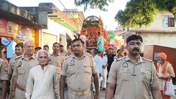 बता दें कि प्रथम दिवस मंदिर परिसर में मंदिर के पुजारी डॉ विजय शंकर मिश्र द्वारा भगवान को विधिवत वस्त्र अलंकार आभूषण सुशोभित कर सजाते हैं इसके बाद प्रथम आरती मंदिर परिसर में आयोजित किया गया। मन्दिर परिसर से निकला इसके बाद लोगों ने अपने छतों से पुष्प वर्षा की और जगह जगह रथ को रोककर मां राधा और कान्हा की लोगों ने पुजन अर्चन कर आरती उतारी। रथ परंपरागत गत मार्गों से होकर देर रात दुर्गा जी मन्दिर के पास स्थित कदंब वृक्ष के पास पहुंचेगा।