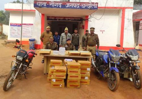 गिरफ्तार अभियुक्तों में बिहार राज्य के कैमूर जनपद के चैनपुर थानांतर्गत उदयराजपुर गांव निवासी अजीत राजभर (23 वर्ष) पुत्र रमेश राजभर व जनपद चन्दौली के सकलडीहा थाना क्षेत्र के नईबाजार गांव निवासी विशाल राजभर (19 वर्ष) पुत्र रमेश राजभर हैं। बरामदगी और गिरफ्तारी के आधार पर थाना नौगढ़ में मु0अ0सं0 103/2025 धारा 60/63 आबकारी अधिनियम के अन्तर्गत मुकदमा पंजीकृत कर के आवश्यक विधिक कार्रवाई किया गया है। फरार दोनों तस्करों की तलाश में पुलिस की दबिश जारी है। पुलिस टीम में प्रभारी निरीक्षक सुरेन्द्र कुमार यादव, उप निरीक्षक अभय सिंह, लालबहादुर यादव, शिवानन्द, हेड कांस्टेबल रामजनम गुप्ता कांस्टेबल विशाल यादव शामिल रहे।