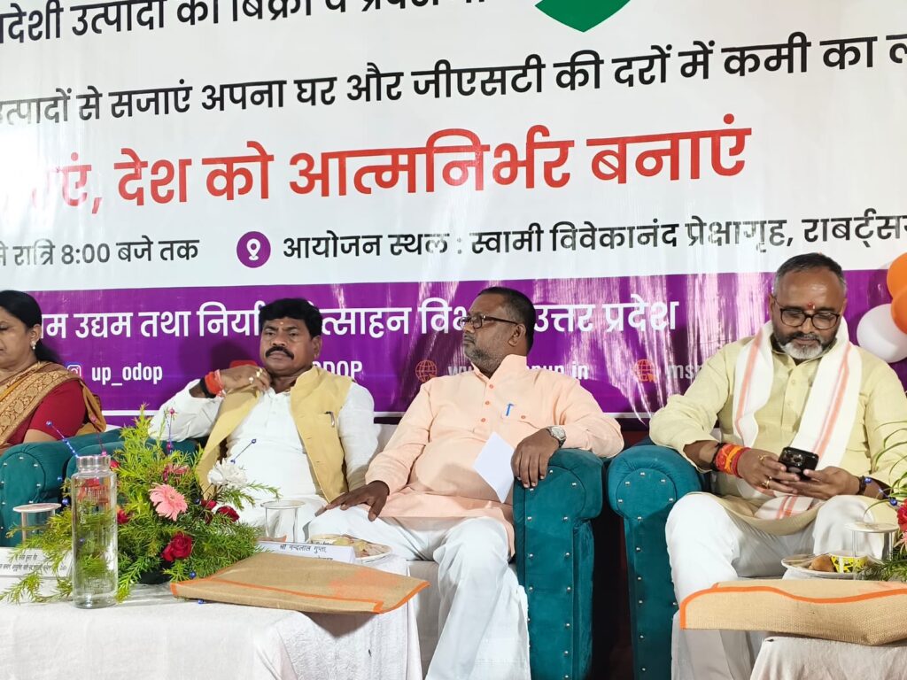 प्रसाद, ब्लाक प्रमुख सदर अजीत रावत, पूर्व भाजपा जिलाध्यक्ष अजीत चैबे, जिला विकास अधिकारी श्री हेमन्त कुमार सिंह, डी0सी0 मनरेगा रवीन्द्र वीर सिंह, उपायुक्त उद्योग अधिकारी बिनोद कुमार चैधरी, सहायक पर्यटन अधिकारी राजेश कुमार भारती, उद्यमी मित्र सोनभद्र नीतिन प्रकाश सिंह, कनिष्ठ सहायक कौशल कुमार सहित सम्बन्धित अधिकारी व कर्मचारीगण उपस्थित रहेें। इस मौके पर मंत्री ने उपस्थित जन मानस को सम्बोधित करते हुए कहा कि हम सभी यहां स्वदेशी