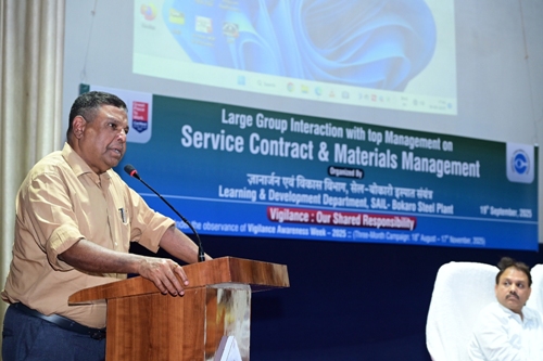 बोकारो । स्टील प्लांट के सतर्कता विभाग द्वारा सतर्कता जागरूकता सप्ताह-2025 के अंतर्गत निवारक सतर्कता पर चल रहे तीन माह के अभियान के क्रम में बीएसएल के शीर्ष प्रबंधन के साथ सेवा अनुबंध और सामग्री प्रबंधन (सर्विस कॉन्ट्रैक्ट एंड मैटेरियल मैनेजमेंट) विषय  पर एक संवाद कार्यक्रम का आयोजन ज्ञानार्जन एवं विकास केंद्र के मुख्य सभागार में आयोजित किया गया. संवाद कार्यक्रम में श्री आलोक वर्मा, निदेशक प्रभारी, राउरकेला स्टील प्लांट एवं अतिरिक्त प्रभार, बोकारो स्टील प्लांट के साथ अधिशासी निदेशक (मानव संसाधन) सुश्री राजश्री बनर्जी, अधिशासी निदेशक (सामग्री प्रबंधन) श्री चित्त रंजन मिश्रा,  अधिशासी निदेशक (संकार्य) श्री प्रियरंजन उपस्थित थे.