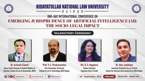 रायपुर, / हिदायतुल्लाह राष्ट्रीय विधि विश्वविद्यालय (एचएनएलयू), रायपुर ने “उभरती न्यायशास्त्र दृष्टि: कृत्रिम बुद्धिमत्ता (AI) का सामाजिक-वैधानिक प्रभाव” विषय पर एक दिवसीय ऑनलाइन अंतर्राष्ट्रीय सम्मेलन का सफल आयोजन किया।