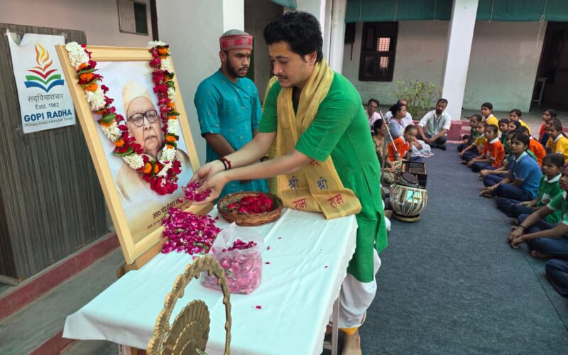 वाराणसी : रवींद्रपुरी स्थित गोपी राधा प्राइमरी स्कूल एवं गर्ल्स इण्टर कॉलेज के संरक्षक स्व. चंद्रशेखर शाह के लिए विद्यालय प्रांगण में शांति पाठ आयोजित किया गया। शांति पाठ रामाचारी संस्कृत महाविद्यालय, अस्सी के वरिष्ठ प्रवक्ता डा. मुकेश कुमार मिश्र ने किया। इस अवसर पर विद्यालय की संगीत की अध्यापिका डा. सोनाली बिसोई व उनकी टीम ने रघुपति राघव राजा राम भजन द्वारा उन्हें स्वरांजलि दी।