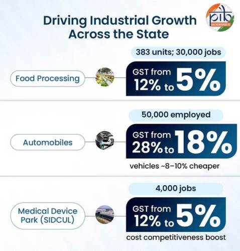 उत्तराखंड में 383 पंजीकृत खाद्य प्रसंस्करण इकाइयाँ हैं, जो मुख्य रूप से रुद्रपुर में स्थित हैं और लगभग 30,000 लोगों को रोजगार देती हैं। जीएसटी दर को 12% से घटाकर 5% करने से मार्जिन में सुधार, मूल्य संवर्धन को प्रोत्साहन और फल प्रसंस्करण, हर्बल उत्पादों और जैविक खाद्य पदार्थों जैसे क्षेत्रों में निवेश को बढ़ावा मिलने की उम्मीद है, जिससे राज्य का कृषि-औद्योगिक आधार मजबूत होगा।