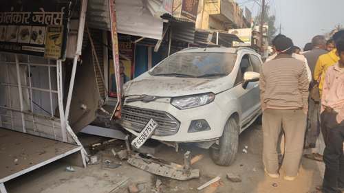 दुद्धी सोनभद्र। दुद्धी तहसील तिराहे सामने स्थित ज्वैलरी की दुकान में अनियंत्रित कार घुसते-घुसते बची, संयोग अच्छा रहा कि दुकान के बाहर लगे इंगल से टकराकर कार रुक गई, वर्ना बड़ी घटना घट सकती थी। देर रात्रि लगभग 1:00 बजे नशे में धूत कार सवारों ने ओवरटेक करने के चक्कर में फैमिली लेकर जा रहे एक कार में पीछे से टक्कर मार दी, जिससे दोनों कार सड़क किनारे स्थित ज्वैलरी की दुकान में जा घुसी, गनीमत रही कि बड़ी दुर्घटना टली। उसी समय सुरक्षा व्यवस्था की जायजा लेने निकल रहे दुद्धी सीओ राजेश कुमार राय की नजर पड़ गई, उन्होंने तत्काल कोतवाली पुलिस की मदद से दोनों कार सवारों दुर्घटना के शिकार हो कार में फंसे हुए लोगों को सुरक्षित निकाल कर ओवरटेक करने वाले कार चालक को कोतवाली थाना ले गए, वही फैमिली वाली कार को उनके गंतव्य की ओर भेजा गया। बुधवार की सुबह दुकान में घुसी कार को देखने के लिए सड़क पर तमाशबीनों की भीड़ लग गई । वहीं दुकान स्वामियों ने कार के टक्कर से हुई नुकसान की भरपाई कराने की मांग किया है।