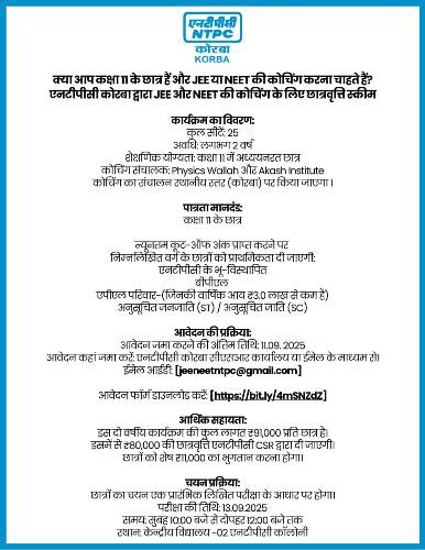 कोरबा। एनटीपीसी कोरबा द्वारा कक्षा 11 के छात्रों के लिए JEE और NEET की तैयारी हेतु निःशुल्क कोचिंग छात्रवृत्ति योजना शुरू की गई है। इस योजना के अंतर्गत 25 छात्रों का चयन किया जाएगा। कोचिंग का संचालन Physics Wallah और Akash Institute द्वारा स्थानीय स्तर पर किया जाएगा। कार्यक्रम की अवधि लगभग दो वर्ष होगी। पात्रता के लिए कक्षा 11 में अध्ययनरत होना आवश्यक है। न्यूनतम कट-ऑफ अंक प्राप्त करने वाले बीपीएल परिवार के छात्र तथा वार्षिक आय तीन लाख रुपये से कम वाले, अनुसूचित जाति (SC) और अनुसूचित जनजाति (ST) वर्ग के विद्यार्थियों को प्राथमिकता दी जाएगी।