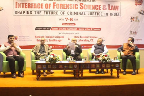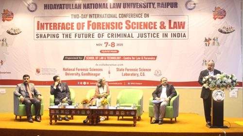 रायपुर/ हिदायतुल्लाह नेशनल लॉ यूनिवर्सिटी (एचएनएलयू), रायपुर के स्कूल ऑफ लॉ एंड टेक्नोलॉजी के अंतर्गत स्थित सेंटर फॉर लॉ एंड फॉरेंसिक्स द्वारा “इंटरफेस ऑफ फॉरेंसिक साइंस एंड लॉ: शेपिंग द फ्यूचर ऑफ क्रिमिनल जस्टिस इन इंडिया” विषय पर दो दिवसीय इंटरनेशनल कॉन्फ्रेंस का सफल आयोजन 7 एवं 8 नवम्बर 2025 को किया गया। यह कॉन्फ्रेंस स्टेट फॉरेंसिक साइंस लेबोरेटरी (एसएफएसएल), रायपुर, छत्तीसगढ़ और नेशनल फॉरेंसिक साइंसेस यूनिवर्सिटी (एनएफएसयू) के सहयोग से आयोजित किया गया ।