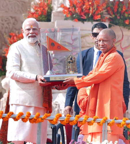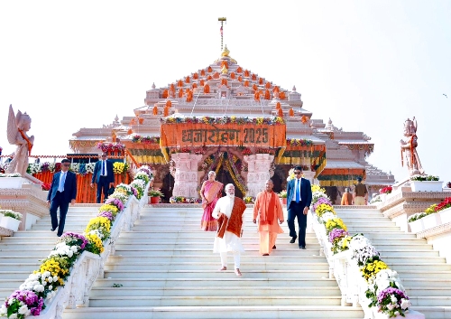 प्रधानमंत्री एवं राष्ट्रीय स्वयंसेवक संघ के सरसंघ चालक ने अयोध्या में श्रीराम जन्मभूमि मन्दिर के शिखर पर, विधिवत मन्त्रोच्चार के साथ धर्मध्वजा का पुनर्स्थापन किया, कार्यक्रम में उ0प्र0 की राज्यपाल, मुख्यमंत्री तथा श्रीराम जन्मभूमि तीर्थ क्षेत्र न्यास के अध्यक्ष सम्मिलित हुए