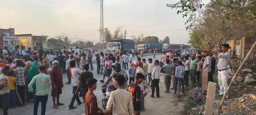 ग्रामीणों ने रोड पर ब्रेकर बनवाने की मांग को लेकर लगाया जाम