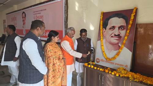 सोनभद्र। भारतीय जनता पार्टी के जिला कार्यालय पर पंडित दीनदयाल उपाध्याय की पुण्यतिथि पर उनकी प्रतिमा पर पुष्पांजलि अर्पित की गई। कार्यक्रम में मुख्य अतिथि पूर्व संगठन मंत्री व प्रदेश कार्यसमिति सदस्य नागेश्वर देव पाण्डेय, नगर पालिका अध्यक्ष रुबी प्रसाद और भाजपा जिलाध्यक्ष नन्द लाल मौजूद रहे।मुख्य अतिथि नागेश्वर देव पाण्डेय ने कहा कि पंडित दीनदयाल उपाध्याय एक प्रमुख राजनीतिक चिंतक और एकात्म मानव दर्शन के प्रणेता थे। उन्होंने व्यक्ति, समाज और प्रकृति के बीच संतुलन पर जोर दिया। उनका मानना था कि विकास केवल भौतिक प्रगति तक सीमित न रहकर मानव के समग्र उत्थान का माध्यम होना चाहिए। नगर पालिका अध्यक्ष रुबी प्रसाद ने उन्हें निस्वार्थ कर्मयोगी बताते हुए कहा कि अंत्योदय का उनका संदेश आज भी मार्गदर्शक है। भाजपा जिलाध्यक्ष नन्द लाल ने कहा कि उनका जीवन राष्ट्र के लिए प्रेरणा का स्रोत है। इस दौरान जिला उपाध्यक्ष ओमप्रकाश दूबे, रामसुन्दर निषाद, कृष्णमुरारी गुप्ता, सरजू बैसवार सहित कई कार्यकर्ता मौजूद रहे।