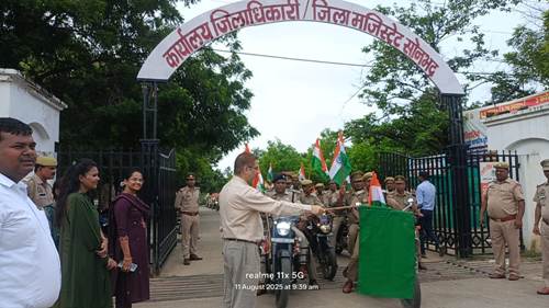 सोनभद्र। जिलाधिकारी बी0 एन0 सिंह ने आज कलेक्ट्रेट परिसर से तिरंगा बाइक रैली को हरी झण्डी दिखाकर रवाना किया । इस तिरंगा बाइक रैली में पुलिस विभाग जिला पंचायत, नगर पालिका सहित विभिन्न विभागों के अधिकारी एवं कर्मचारी सम्मिलित रहे तिरंगा बाइक रैली कलेक्ट्रेट परिसर से प्रारम्भ होकर रामलीला मैदान पर पहुंची इस दौरान जिलाधिकारी ने जनपद वासियों से अपील की है कि प्रत्येक नागरिक के अपने आवास/स्कूल तथा सरकारी कार्यालयों में तिरंगा झण्डा को सम्मान के साथ झण्डा संहिता का अनुपालन करते हुए फहराना है । झण्डा फहराते समय सदैव केसरिया रंग की पट्टी झंडे के ऊपर की तरफ होनी चाहिए, झंडे को यदि सरकारी परिसर में फहराया जाता है, तो सूर्याेदय के उपरान्त ध्वजारोहण किया जाना चाहिए तथा सूर्यास्त के बाद सम्मान के साथ उतारना चाहिए, निजी आवास एवं प्रतिष्ठानों पर लगाये जाने वाले झण्डों को उक्त समय अवधि के उपरान्त आदर भाव के साथ उतार कर सुरक्षित रखा जायेगा। झण्डा उतारने के बाद किसी भी नागरिक के द्वारा इसे फेका नहीं जाएगा, उसे सम्मान के साथ फोल्ड करके रखा जाना चाहिए। इस दौरान रामलीला मैदान में मुख्य विकास अधिकारी ने उपस्थित जनमानस को सम्बोधित करते हुए कहा कि हर घर पर झण्डा विधिवत तरीके से लगाया जाना चाहिए, आधा झुका, फटा या कटा झण्डा लगाया जाना निषेध होगा । ध्वज झुका हुआ न हो। किसी दूसरे ध्वज या पताका को राष्ट्रीय ध्वज से ऊंचा या ऊपर नहीं लगाया जाएगा, न ही बराबर में रखा जायेगा। ध्वज पर कुछ भी लिखा या छपा नहीं होना चाहिए। इस मौके पर जिला पंचायत राज अधिकारी नमिता शरण, सहित सम्बन्धित अधिकारी व कर्मचारी गण उपस्थित रहे।