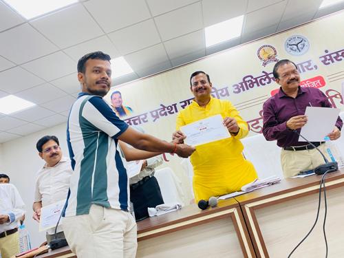 लखनऊः अन्तर्राष्ट्रीय अभिलेख दिवस के अवसर पर दिनांक 09 से 14 जूनए 2025 के मध्य अपराह 3ः00 बजे से सायं 5ः00 बजे तक उत्तर प्रदेश राजकीय अभिलेखागार परिसर के अन्तर्गत शहीद स्मृति भवन में श्अभिलेख के प्रबन्धन एवं संरक्षणश् विषयक 06 दिवसीय कार्यशाला का आयोजन किया गया। कार्यशाला में छठवें दिन दिनांक 14-06-2025 को डॉ० एस०एन० चौबे, विभागाध्यक्ष, सिद्धार्थ विश्वविद्यालय, विशिष्ट अतिथि दिलीप कुमार गुप्ता, वित्त नियंत्रक, संस्कृति निदेशालय, उ० प्र०. एसोसिएट प्रो० डॉ० सुशील कुमार पाण्डेय को निदेशक, उ० प्र० राजकीय अभिलेखागार अमित कुमार अग्निहोत्री ने अंगवस्त्र देकर सम्मानित किया। कार्यक्रम में 137 शोधार्थी उपस्थित रहे। मुख्य अतिथि डॉ० एस०एन० चौबे द्वारा कार्यशाला के सभी प्रतिभागियों को प्रमाण पत्र देकर सम्मानित किया गया।
